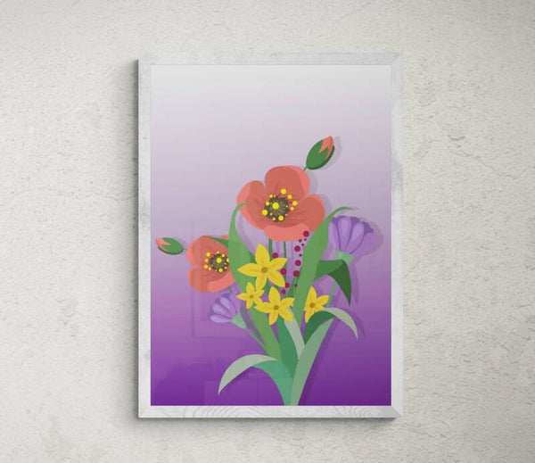 Les fleurs rouges, jaunes et violettes contrastent harmonieusement avec le vert du fond, créant une composition dynamique et éclatante. Les touches de jaune dans les fleurs rouges ajoutent une touche de luminosité et d'énergie.