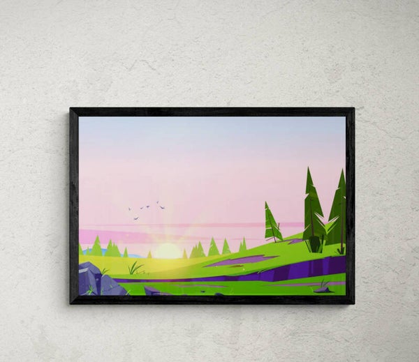 Avec un design minimaliste et stylisé, ce poster présente des formes géométriques qui accentuent la simplicité et l'élégance du paysage. L'utilisation de silhouettes crée un contraste saisissant et attire l'œil vers les détails subtils de la nature.