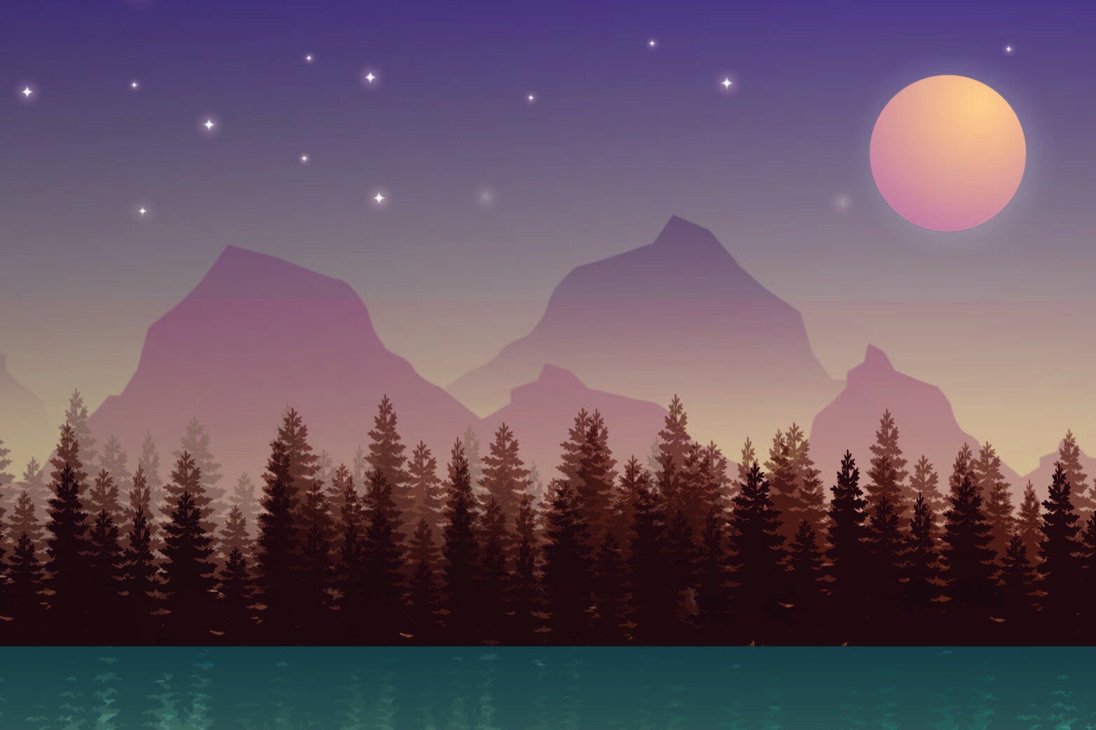 Les dégradés pastel évoquent un coucher de soleil apaisant, tandis que les silhouettes sombres des conifères et des montagnes ajoutent de la profondeur à la composition. La réflexion sur l'eau tranquille amplifie l'effet de sérénité.